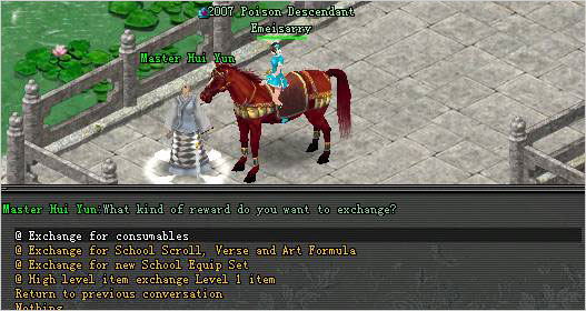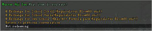 ការប្តូររង្វាន់: បន្ទាប់ពីបើកប្រអប់រួច អ្នកអាចទទួលបាន School Charm មួយចំនួន ដូច្នេះUpon you have collected certain amount of School Charm, ដូច្នេះអ្នកអាចទៅជួប NPC School Secret Chamber ដើម្បីប្តូររង្វាន់ រួមទាំងសម្ភារៈប្រើប្រាស់ផ្សេងៗដូចជា school scroll/verse/art and advance school equipment.