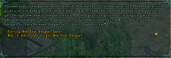 - នៅពេលដែលតួអង្គមាន Booze Banquet គ្រាន់តែចុច Right clickទៅលើ Booze Banquet រួចចុចយកពាក្យ””””” Putting New Year Banquet Here ! ”ជាការស្រេច