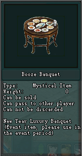 - ដើម្បីទទួលបាន Booze Banquet អ្នកកម្សាន្តត្រូវចូលរួមជាមួយព្រឹត្តិការណ៍ចូលឆ្នាំថ្មីដោយប្រើ Dinner Table អោយបានចំនួន២០និងទទួលបាន Booze Banquet ចំនួនមួយ។