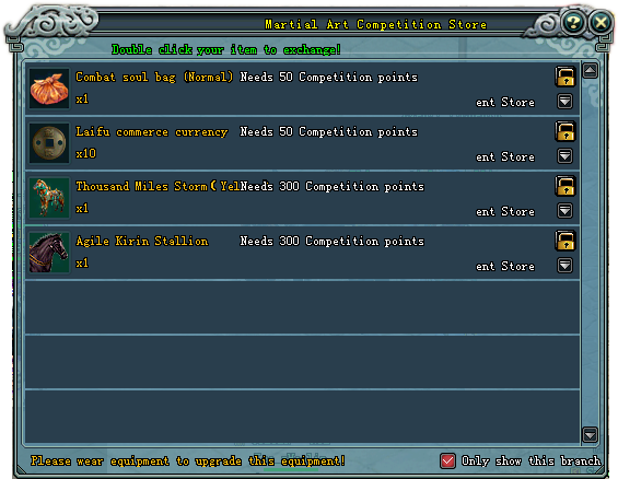 ដើម្បីប្តូរយក LaiFu Commerce currency ពីMartial art Competition’s Store គឺតម្រូវតួអង្គនិមួយៗចូលរួមជាមួយ ការប្រកួត PVPដើម្បីទទួលបាន Competition Points ជាមុនសិន។បន្ទាប់ពីមាន Competition points គ្រប់គ្រាន់ហើយលោកអ្នកគ្រាន់តែចូលទៅកាន់ Martial art Competition’s Store តាមរយៈ NPC Tournament Ambassador ហើយជ្រើសយក Martial art Competition’s store ពេលនោះនិងចេញដូចរូបខាងក្រោម៖