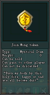 បន្ទាប់ពីលោកអ្នកធ្វើដំណើរទៅដល់បក្សម៉ីងហើយដំបូងអ្នកត្រូវទៅជួបមេបក្សម៉ីងដែលឈ្មោះថា Fang La (181/187)បន្ទាប់មកជ្រើសរើសយកពាក្យថា I want to join Ming religious