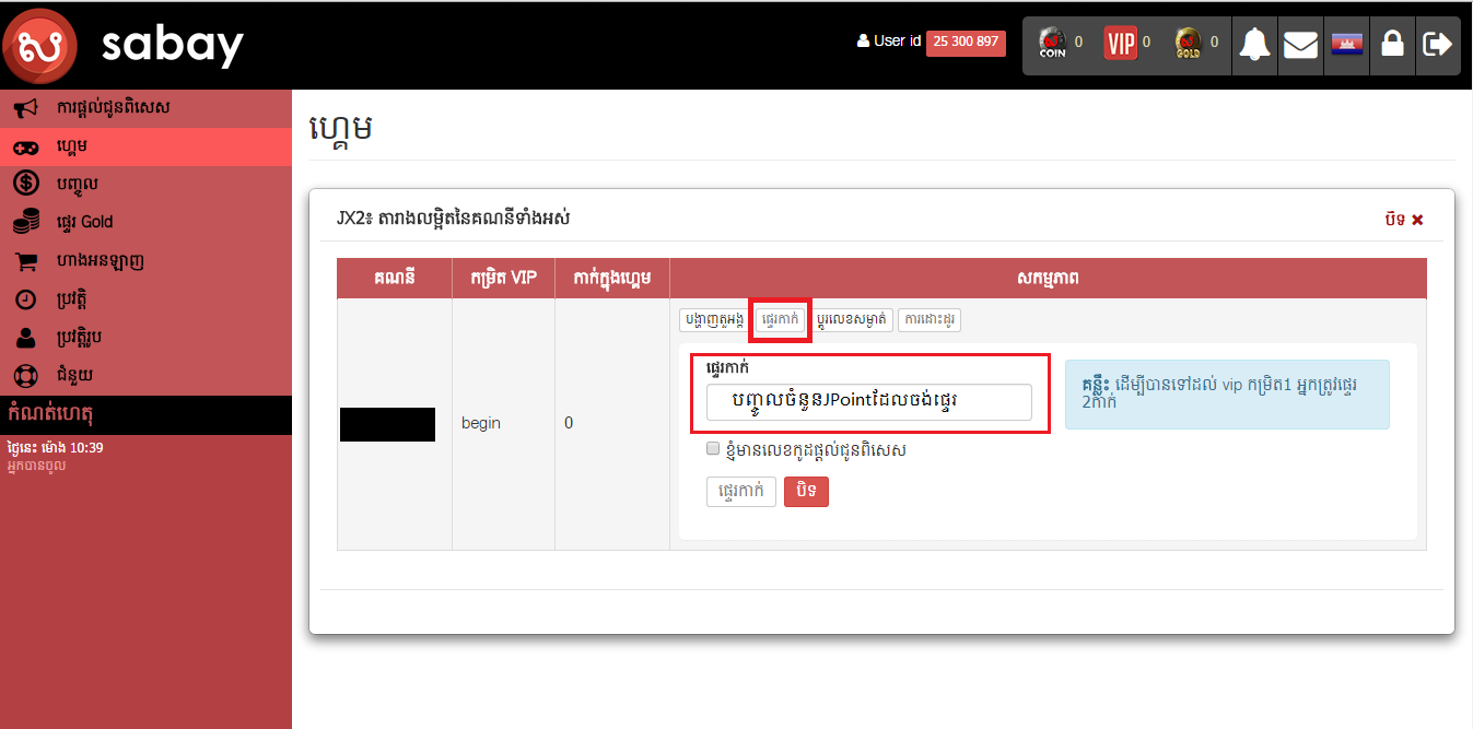 ដំបូងអ្នកកម្សាន្តគ្រាន់តែចូលទៅកាន់ mysabay.com បន្ទាប់មកវាយបញ្ជូលគណនីរបស់លោកអ្នករួចហើយធ្វើការផ្ទេរ sabay coins ទៅជា jpoint ទៅតាមចំនួនកំណត់ដូចជា 20, 40, 60, 80, 100…… ដើម្បីទទួលបាន (Gift) នៅមាតិកាខាងផ្នែកខាងឆ្វេងដែលមានឈ្មោះថា ហ្គេម។ នៅពេលដែលអ្នកកម្សាន្តធ្វើការផ្ទេររួចហើយនោះនិងទទួលបាន (Gift) ទៅតាមចំនួនដែលបានផ្ទេរ។