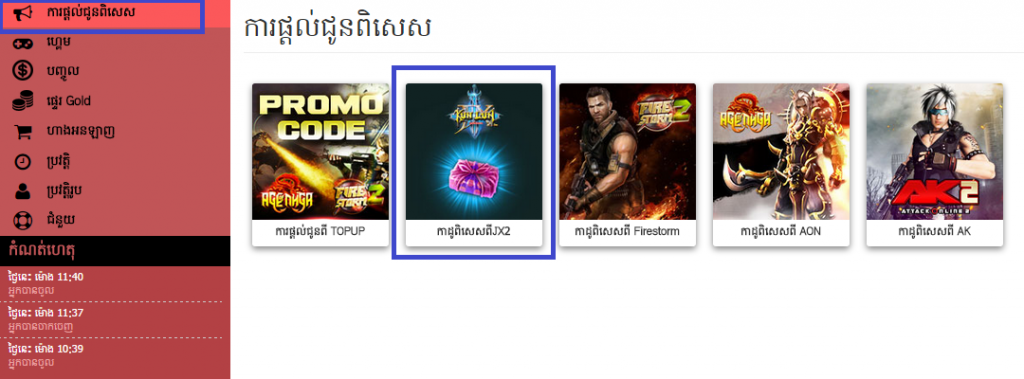 បន្ទាប់មក អ្នកចុចយកពាក្យថា ការផ្តល់ជូនពិសេស ហើយចុចយក កាដូពិសេសពីJX2 ដើម្បីធ្វើការផ្ទេរកាដូដែលមានទៅកាន់តួអង្គ និង នគរដែលអ្នកចង់ទទួលយកនៅក្នុងពិភពនិស្ស័យស្នេហ៍ដាវទេព