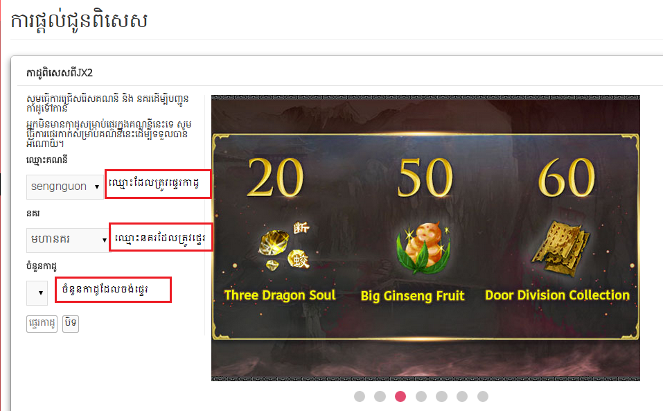ចំនុចនេះ លោកអ្នកត្រូវធ្វើការជ្រើសរើសយកឈ្មោះតួអង្គ នគរណា និង ចំនួនកាដូ ដែលលោកអ្នកចង់ទទួលបាន Gift ហើយចុងក្រោយសូមចុចពាក្យថា ផ្ទេរ ជាការស្រេច