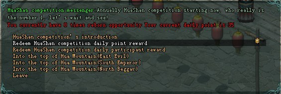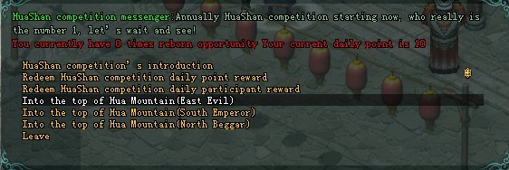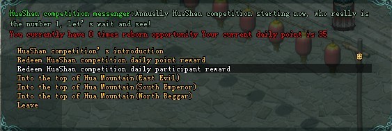 អ្នកអាចទទួលបានរង្វាន់ជា Exp ទៅតាម Lvl តួអង្គរបស់អ្នកដោយគ្រាន់តែចូលទៅដល់ក្នុង Map Huashan ហើយឱ្យគេសម្លាប់ម្ដងដើម្បីចេញមកក្រៅវិញបើករង្វាន់ពី NPC HuaShan competition messenger ដោយជ្រើសយកពាក្យថា Redeem HuaShan competition daily participant reward