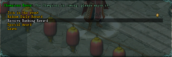 • ដើម្បីយករង្វាន់បានអ្នកត្រូវទៅជួប”Champion Envoy”​ ដែល​មាន​ទី​តាំង​នៅក្រុង BianJing (177/174)​រួចរេីសយក”Receive ranking reward”