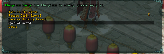 • អ្នក​អាច​ទទួល​បាន​រង្វាន់ការចូលរួមជា Exp 1,000,000 និង​ Warrior Box*10 ក្នុងមួយតួអង្គ​របស់​អ្នក​ដោយ​គ្រាន់​តែ​ចូល​ទៅ​ដល់​ក្នុង Map “Champion”។