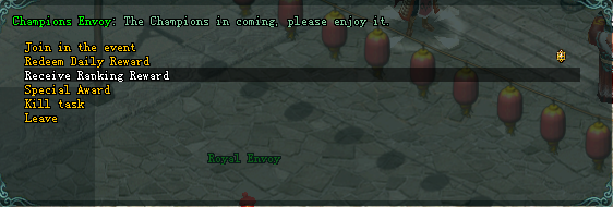 • ដើម្បីយករង្វាន់បានអ្នកត្រូវទៅជួប”Champion Envoy” ដែលមានទីតាំងនៅក្រុង BianJing (177/174) រួចរេីសយក “Receive ranking reward”។ រង្វាន់ទាំងនេះ
