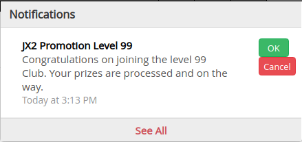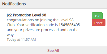 - រង្វាន់នឹងត្រូវមានការដឹកជញ្ជូនដល់ទីកន្លែង(សម្រាប់តែតួអង្គកម្រិត(level) 99 តែប៉ុណ្ណោះ) ។ សម្រាប់តួអង្គដែលមានកម្រិត(level) ចាប់ពី90-98 ត្រូវធ្វើការបើកយករង្វាន់នៅក្រុមហ៊ុនយើងផ្ទាល់តែម្តង(សម្រាប់អ្នកកម្សាន្តដែលនៅទីរួមខេត្តក៏អាចធ្វើការបើកយករង្វាន់នេះបានដែរ ដោយធ្វើការរក្សាលេខកូតផ្ទៀងផ្ទាត់នេះក្នុងការបើកយករង្វាន់ សម្រាប់ព័ត៌មានលម្អិតលោកអ្នកអាចធ្វើការទាក់ទងមកពួកយើងតាមរយៈ Facebook Page(JX Sabay *OfficialPage) ឬតាមរយៈលេខទូរស័ព្ទ 023 226 000)