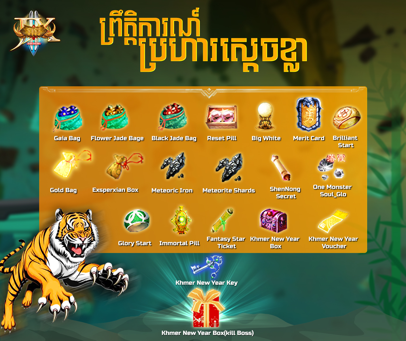បញ្ជាក់៖ ចំពោះតួអង្គណា ដែលជាអ្នកសម្លាប់Tiger King ចុងក្រោយនឹងទទួលរង្វាន់ភ្លាមៗ គឺ Exp: Level*Level*100 (ឧទាហរណ៍: Lv.80 នឹងទទួលបាន 80*80*100=640,000 EXP) ព្រមទាំង Khmer New Year Box *10 ។