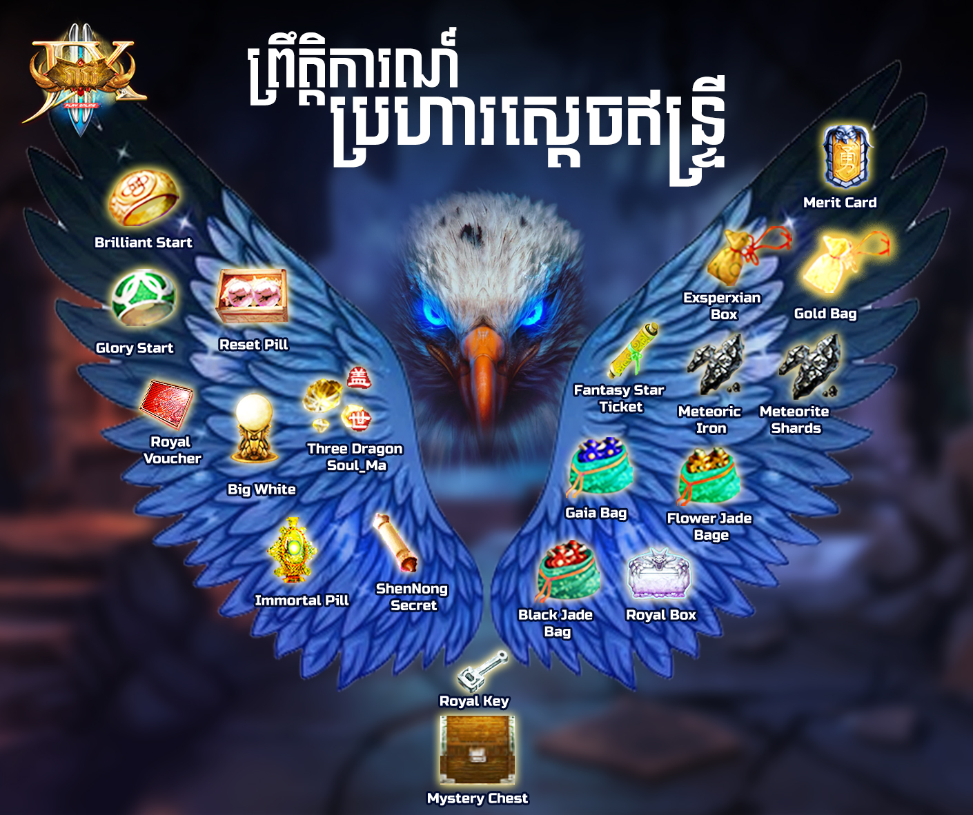 បញ្ជាក់៖ ចំពោះតួអង្គណា ដែលជាអ្នកសម្លាប់ Eagle King ចុងក្រោយនឹងទទួលរង្វាន់ភ្លាមៗ គឺ Exp: Level*Level*100 (ឧទាហរណ៍: Lv.80 នឹងទទួលបាន 80*80*100=640,000 EXP) ព្រមទាំង Royal Box*10