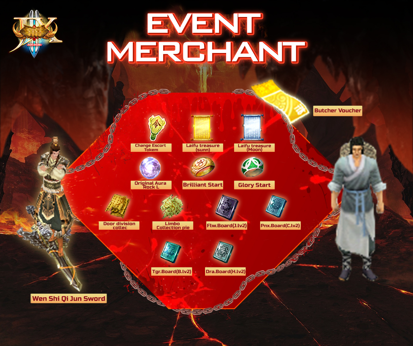 • អ្នកអាចយក Butcher Voucher ទាំងនេះទៅផ្លាស់ប្តូររយករង្វាន់ផ្សេងៗបានពី NPC Event Merchant(176/174) ដែលស្ថិតនៅកណ្តាលក្រុង Bianjing