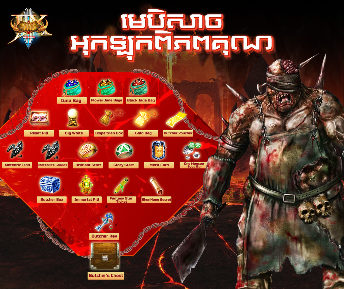បញ្ជាក់៖ ចំពោះតួអង្គណា ដែលជាអ្នកសម្លាប់ Butcher ចុងក្រោយនឹងទទួលរង្វាន់ភ្លាមៗ គឺ Exp: Level*Level*100 (ឧទាហរណ៍: Lv.80 នឹងទទួលបាន 80*80*100=640,000 EXP) ព្រមទាំង Butcher Box*10
