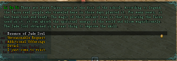 គ្រាប់ពូជ Taixu មានគុណភាពខុសៗគ្នា រង្វាន់ក៏ទទួលបានតាមគុណភាពរបស់វា Playerដែលមានគ្រាប់ពូជ អាចចុចទៅលើដើមឈើបុរាណTaixuដែលនៅក្នុងជុំរំរបស់ខ្លួន រួចជ្រើសរើសពាក្យ “Planting seeds ”ក្នុងពេលតែមួយPlayerម្នាក់អាចដាំគ្រាប់ពូជបានយ៉ាងច្រើន2 គ្រាប់ Playerអាចចុចលើដើមឈើបុរាណម្តងទៀតដើម្បីពិនិត្យមើលស្ថានភាពរបស់វា មានតែគ្រាប់ពូជរបស់ខ្លួនតែប៉ុណ្ណោះដែលនឹងត្រូវបង្ហាញប្រាប់ពី “ឈ្មោះគ្រាប់ពូជ គុណភាពគ្រាប់ពូជ ដំណាក់កាលនៃភាពលូតលាស់របស់គ្រាប់ពូជ ពេលវេលានៃការបានផលរបស់គ្រាប់ពូជ”។ Playerត្រូវការមើលថែគ្រាប់ពូជសរុបចំនួន 4 ដំណាក់។ រៀងរាល់ 1 ម៉ោង គ្រាប់ពូជនឹងឈានដល់ដំណាក់កាលបន្ទាប់ Playerអាចចុចដើម្បីមើលថែ នៅពេលដែលPlayerចុចមើលថែ អ្នកនឹងទទួលបានរង្វាន់ ប្រសិនបើPlayerមិនចុចមើលថែទេ គ្រាប់ពូជនឹងចូលដំណាក់កាលបន្ទាប់ដោយស្វ័យប្រវត្តិបន្ទាប់ពី 30 នាទី(មិនទទួលបានរង្វាន់សម្រាប់ការមើលថែ)។ ចូលដល់ដំណាក់កាលទី4 នឹងទទួលបាន Jade Soul ដែលអាចយកទៅប្ដូររង្វាន់ជាមួយNPCដែលយើងជួប ពេលទទួលយកMission នោះ ចំណាំ:ប្រសិនបើលើសពី5 ម៉ោងហើយPlayer មិនបានទៅយក Jade Soul នោះវានឹងរលួយបាត់ ។