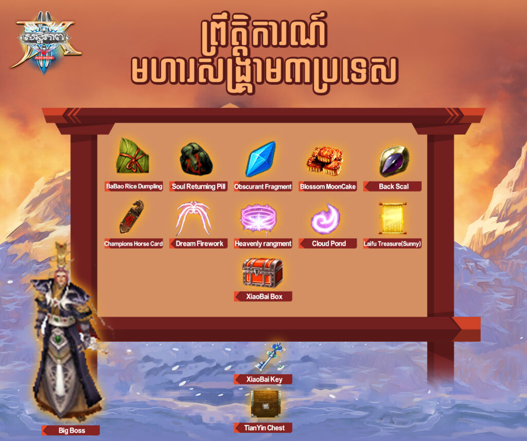 - សម្រាប់តួអង្គដែលសម្លាប់Big Bossក្រោយគេបង្អស់នឹងទទួលបាន XiaoBai Box 100 War Treasure(H) 1 (3ថ្ងៃ) និងObscurant fragment 10។