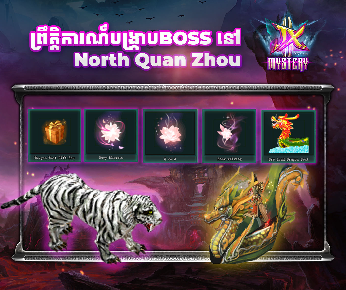 - ចំពោះតួអង្គណាដែលជាអ្នកសម្លាប់BOSSចុងក្រោយនឹងទទួលរង្វាន់ភ្លាមៗដូចជា ៖ 3000000Exp , Dragon Boat Gift Box*1 និងមានឱកាសទទួលបាន Pegasus រយះពេល 7ថ្ងៃ