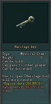 បន្ទាប់ពីបានចូលរួមជាមួយព្រឹត្តិការណ៍ដូចខាងលើនោះរួចមក អ្នកកម្សាន្តនិងទទួលបាន Heritage Box ហើយ អ្នកកម្សន្ត និងទទួលបានរង្វាន់ជាច្រើនទៀតពីការបើក Heritage Box ដោយផ្ទាល់ឬដោយការប្រើប្រាស់ Heritage key (Imperial Street )។